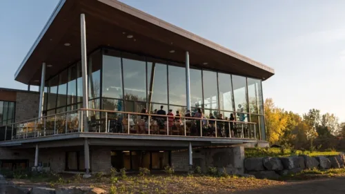 C’est l’architecte Pierre Thibault qui a pensé et dessiné la structure du bâtiment. Son infrastructure est entièrement composée de matériaux québécois. Le complexe récupère également les eaux de pluie afin de les réutiliser pour arroser la végétation qui orne l’espace.